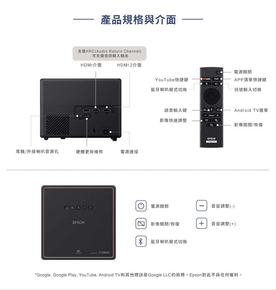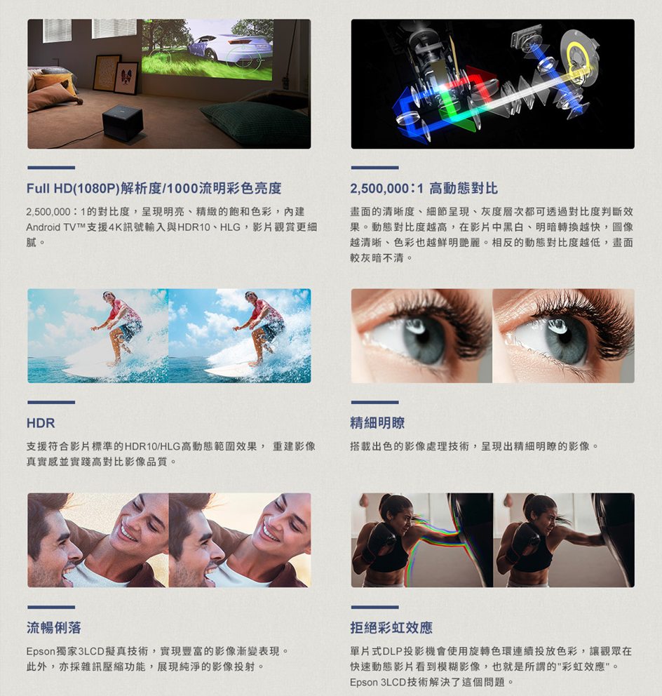 品牌 EPSON 愛普生 型號 EF-12 類型 微型 顏色 黑色 產地 其他國家 尺寸(長x寬x高)(cm) 17.5x17.5x13.5(含腳架) 投影畫面尺寸 30" to 150" 投影亮度(lm) 1000流明 對比 over 2,500,000:1(動態) 投射比例 1 投射距離 - 畫面比例 16:9, 4:3 支援解析度 1080P HDTV相容性 - 燈泡最大壽命(小時) 20000/20000小時 解析度 Full HD (1920x1080) 內建喇叭 有內建喇叭 電源供應 100V-120V / 200V-240V AC, 50/60 Hz 消耗功率 100-120V 102W/73W 、200-240V 102W/73W 重量(g) 2100 保固 一年 BSMI認證碼 - BSMI許可字號 - 備註 上述規格如有錯誤,請以原廠公告為準。 商品保證